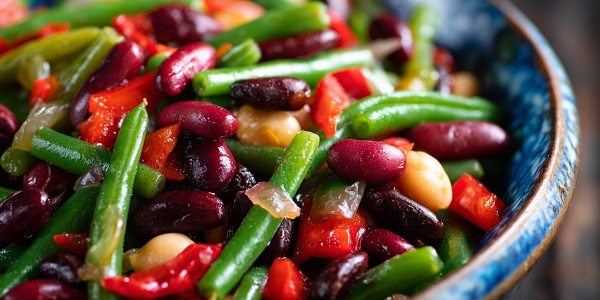 Traditionally, this salad combines green beans, red kidney beans, and butter beans, but you can use a mix of your favourites, such as chickpeas or cannellini beans. The beans are tossed with onions and peppers, then coated in a vinegar-sugar dressing that gives them their signature sweet-and-sour taste.