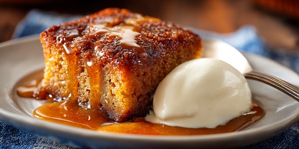 - Once the pudding is baked, remove it from the oven and immediately pour the hot sauce over it.